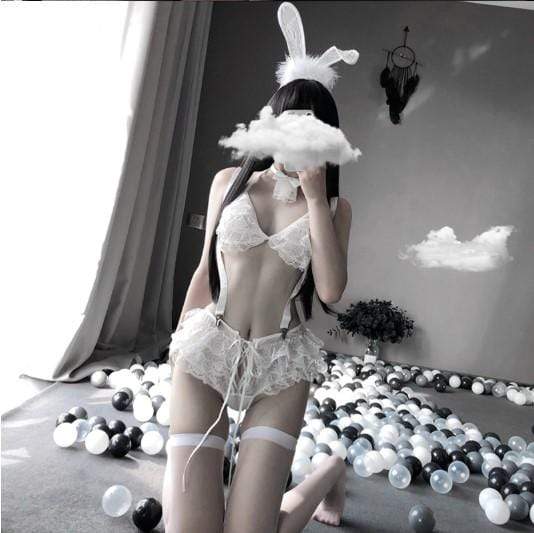 Adding more excitement this set includes the hairband, choker, and suspender garter belt, plus comes in your choice of black or white.